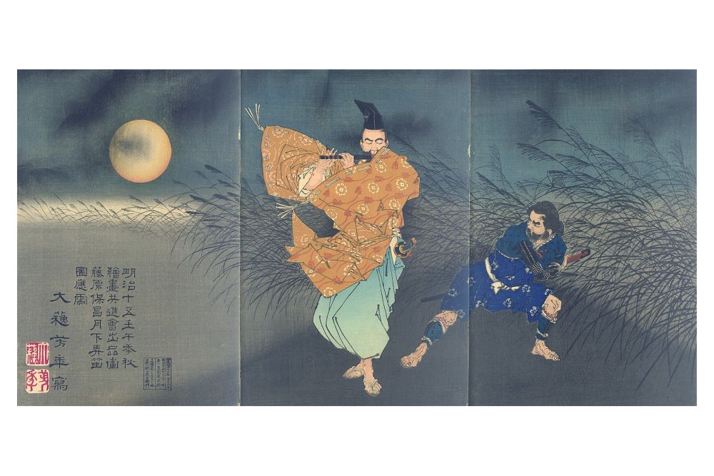 Allen Blättern gemeinsam ist der Mond, der manchmal nur in der integrierten Textbeschreibung vorkommt. In der japanischen Kultur symbolisch zu verstehen, wird er in der Ausstellung – am Rande der Holzschnitt-Folge – in seiner Bedeutung noch für sich betrachtet; zudem sind Blätter weiterer Künstler und Objekte aus der Sammlung des Museums zu sehen. Im Licht des Mondes aber treten in Yoshitoshis Folge bedeutende, in der Überlieferung verbürgte Akteure aus der Vergangenheit des Landes in Erscheinung; als Krieger oder Kriegsherr, als Dichterin oder als Bambussammler, Bogenschütze oder Flötenspieler oder als buddhistische Gottheit. Jeweils gekleidet in prunkvolle Gewänder, teils auch als Rückenfigur und teils in Architekturdetails eingebunden, vereint sie die Komplexität der Geschehnisse und Verflechtungen im Leben; sie benennen in einem temperamentvollen Realismus konkrete Orte. Neben dem Mond, der an ganz unterschiedlichen Stellen im Bild auftauchen kann, verbindet die Holzschnitte die Anordnung von Textfeldern, die noch die Klarheit im Bildaufbau steigert. Man muss nicht im Detail wissen, worum es hier geht, welches Kapitel der japanischen Geschichte gerade aufgeschlagen ist: Yoshitoshis virtuose Fähigkeit zum Fabulieren alleine reicht, dass die Betrachtung seiner „Ansichten des Mondes“ ein Erlebnis wird.