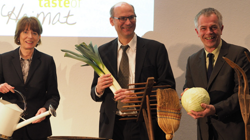 NRW-Umwelt- und Verbraucherschutzminister Johannes Remmel erklärte, sich auf die Zusammenarbeit mit dem Ernährungsrat zu freuen, als einer „Bewegung von unten“ und einer „gesellschaftlichen Innovation“. Er warb für die verstärkte Direktvermarktung regionaler Lebensmittel im Rahmen der Initiative Taste of Heimat e.V., die den Ernährungsrat ins Leben rief. Valentin Thurns Doku „Taste the Waste“ sei „politisch spürbar“ gewesen. Noch immer würden bei uns 11 Mio. Tonnen oder ein Drittel der Lebensmittel im Müll landen, außerdem gingen, so Remmel, nur 45 Prozent der Getreideernte in die Ernährung, der Rest werde zu Futtermitteln und Energie. Auch er sprach von den landwirtschaftlichen Betrieben im „drittgrößten Agrarland“ der Republik: