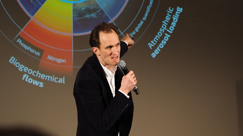 Der Kölner Schauspieler Severin von Hoensbroech untermauerte die Gedanken des Abends mit einer leidenschaftlichen Rede über die destruktiven Auswirkungen industrieller Landwirtschaft, sprach über die kurzfristige Kultivierung von Wüsten in Saudi-Arabien in den 90ern und die problematische Idee, mit mineralischem Stickstoff dem Wachstum von Getreide nachzuhelfen, nur um dann etwa auf Kosten der Biodiversität mit Pestiziden und Herbiziden die Probleme auszuschalten. Zudem gase der Mineraldünger als Stickoxid beim Umpflügen aus oder gehe in die Meere: „Er wird nur zu etwa 30 bis 50 Prozent von der Pflanze aufgenommen.“ Außerdem würden bei der Herstellung des Düngers ungefähr 320 Liter Mineralöl pro Ausbringungs-Hektar verbraucht. Von den Effekten auf das Klima sei allerdings in Paris keine Rede gewesen. Er verwendete die Studie „Planetary Boundaries“ (Nature 09/2009), um am Beispiel des Stickstoff-Phosphor-Kreislaufes deutlich zu machen, dass die Natur nur als Gesamtsystem richtig funktioniere. Selbst das Flüchtlingsproblem sei mit auf Wasserverteilung in Syrien zugunsten des Exports zurückzuführen, was in den letzten Jahren zu einer Landflucht geführt habe. „Was wir brauchen, ist eine gute und nachhaltige Landwirtschaft.“