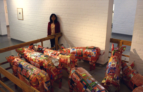 Die Künstlerin Mari Terauchi stammt aus Ansbach und beschäftigt sich in ihrer Arbeit „Woher kommen sie?“ mit einem Thema, das im Moment in aller Munde ist: Fleisch aus der Massenproduktion. Krisen wie die BSE Seuche und die Geflügelpest inspirierten sie dazu, hinter die Kulissen zu schauen und sich zu fragen: Was essen wir da eigentlich Tag für Tag? Terauchis Gedanken zu dieser Frage werden in ihrem Werk, einer Rauminstallation, gebündelt: Aus Fleischverpackungen, die sie eigenhändig in einem Wertstoffzentrum gesammelt hat, stellt sie Tierskulpturen (momentan Schweine und Hühner, Rinder sind in Planung) her. Es ist ihr sehr wichtig, ausschließlich bereits benutzte Verpackungen für ihre Arbeit zu verwenden. Die Rauminstallation wird von Tonaufnahmen aus einem Mastbetrieb begleitet, die die Künstlerin selbst aufgenommen hat. Der Anblick der Tierskulpturen setzt in Verbindung mit den Aufnahmen beklemmende Gefühle frei. Terauchi sei nicht per se gegen Massenproduktion, betont sie. Ihr sei es lediglich wichtig, die Menschen dazu zu animieren über die Herkunft des Fleisches, das tagtäglich gegessen wird, zu reflektieren. Und das gelingt ihr mit dieser Arbeit allemal!